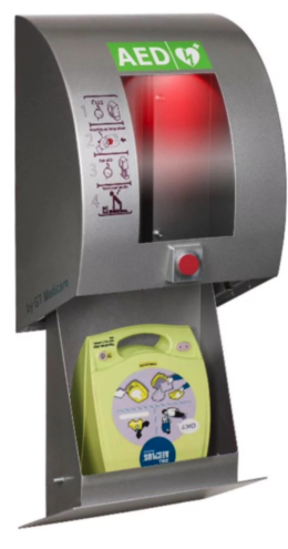 Bare trykk på den røde nødknappen, så får alle rask og enkel tilgang til hjertestarteren. Når skapet åpnes, glir den nederste hyllen ned, den røde LED-belysningen blinker og en høy alarm lyder.